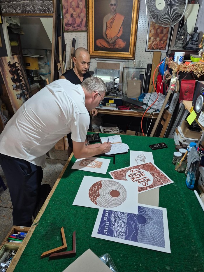 Den Danske Kirke i Thailand har fået en helt særlig donation til vores hus i Bangkok. Det drejer sig om 5 linoleumstryk af kunstner og sognepræst Inge Marie Kirketerp Hansen der til dagligt at præst ved Gjellerup Kirke nær Herning.